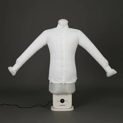 Pour obtenir le meilleur résultat, la chemise doit être légèrement humide. Nous recommandons d’utiliser des chemises directement sorties de la machine à laver. Si vous souhaitez repasser une chemise sèche de l’armoire, elle peut facilement être humidifiée à l’aide d’un pulvérisateur une fois installée dans la machine.